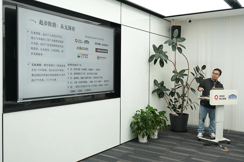 W sali konferencyjnej pracownicy Sekcji Sprzętu Miejskiego Biura Przemysłu i Technologii Informacyjnych w Quanzhou wyjaśnili podstawową sytuację, historię rozwoju i perspektywy na przyszłość branży produkcji sprzętu w Quanzhou; wyświetlono także film promocyjny firmy Quanzhou Machinery Industry Co., Ltd.